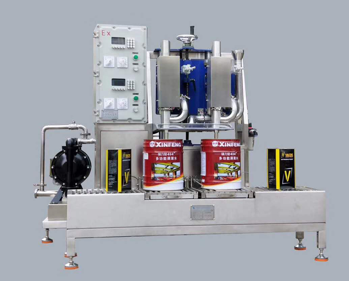 Suitable for filling open round barrels within 60kg, both double-head filling and single-head operation are possible. The system adopts programmable PLC control, full English guidance, easy operation; manual barrel loading, automatic filling., equipped with automatic clamping lid.